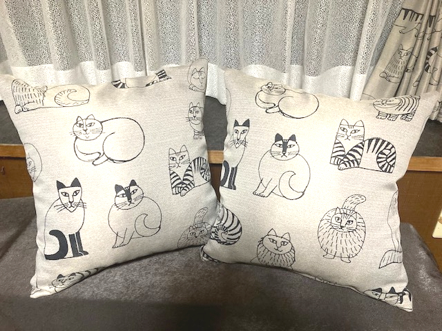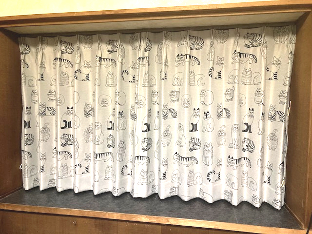 LISA LARONの「ステッチ 遮光」シリーズ。手書きの柔らかなラインで描かれた表情豊かな猫たちがデザインされた落ち着いた色合いのカーテンを取り付けました。(ウォッシャブル・遮光・保温) レースは、無地レースを使用。(ウォッシャブル)